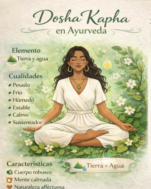 El dosha Kapha representa la energía de la estabilidad, la nutrición y la estructura. Surge de la combinación de los elementos tierra y agua, lo que le confiere cualidades como solidez, calma y resistencia.